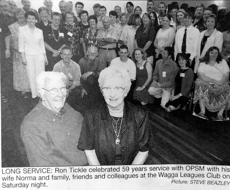 - Ron Tickle celebrated 59 years’ service with OPSM with his wife Norma and family, friends and colleagues at the Wagga Leagues Club.