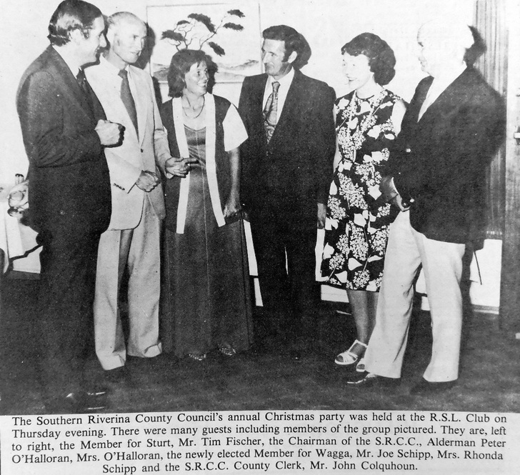 - Tim Fischer, Peter O’Halloran, Mrs O’Halloran, Joe Schipp, Rhonda Schipp and John Colquhoun were among those attending the Southern Riverina annual Christmas party at the R.S.L. Club.