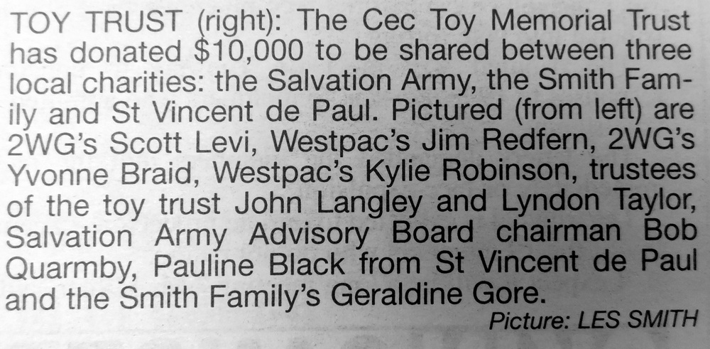 - The Cec Toy Memorial Trust donated $10,000 to be shared between three local charities: the Salvation Army, the Smith Family and St Vincent de Paul.