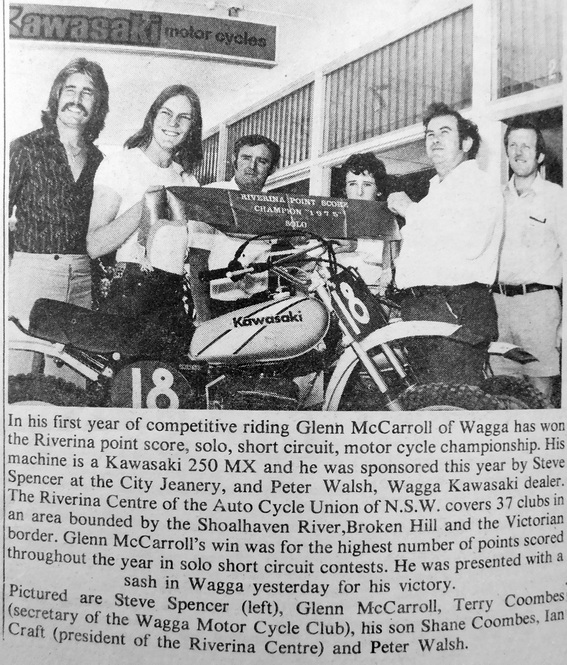 - Glen McCarroll won the Riverina point score, solo, short circuit, motorcycle champion sponsored by Steve Spencer at the City Jeanery and Peter Walsh, Wagga Kawasaki dealer.