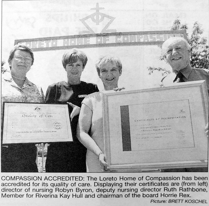 - Director of Nursing, Robyn Byron and deputy nursing director Ruth Rathbone from the Loretto Home of Compassion are pictured with Member for Riverina, Kay Hull and chairman of the board, Horrie Rex displaying certificates of accreditation.