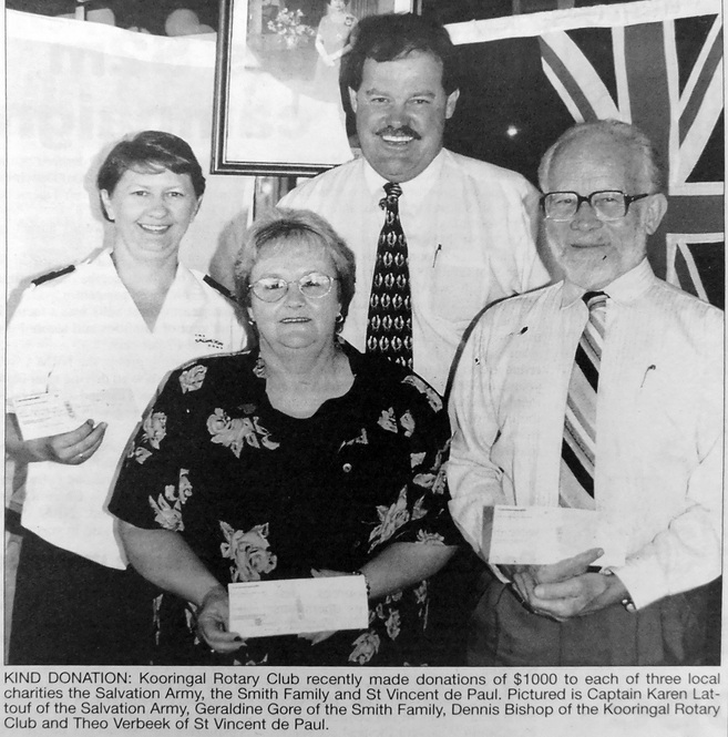 - Dennis Bishop, representing Kooringal Rotary made donations of $1000 to each of three Wagga charities the Salvation Army, the Smith Family and St Vincent de Paul.