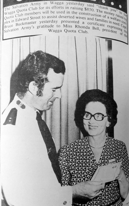 - Miss Rhonda Bell, president of the Wagga Quota Club presented Captain Bruce Buckmaster from the Salvation Army with a cheque for $850 to be used in the construction of a welfare complex in Edward Street.