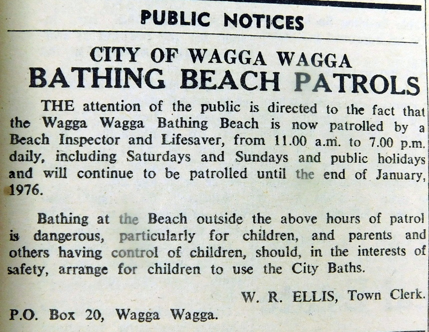 - Town Clerk Mr W R Ellis advises that the Wagga Bathing Beach is now patrolled by a Beach Inspector and Lifesaver from 11am to 7pm daily until the end of January.