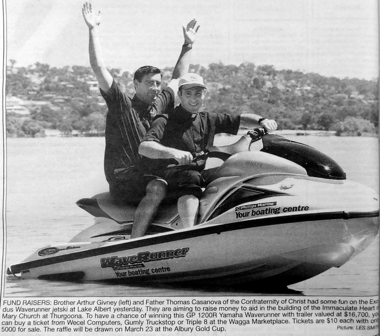 - Brother Arthur Givney and Father Thomas Cassanova of the Confraternity of Christ had some fun on a Waverunner jet ski at Lake Albert which will be raffled to raise money to aid in the building of the Immaculate Heart of Mary Church at Thurgoona.