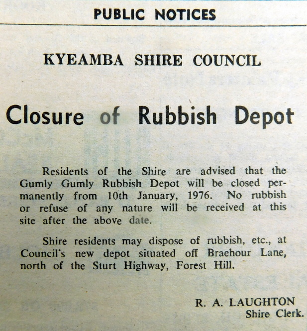 - Kyeamba Shire advises that the Gumly Gumly Rubbish Depot will close permanently on the 10th ofJanuary. A new depot has been opened off Braehour Lane north of the Sturt Highway at Forest Hill.