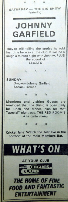 - Johnny Garfield and the sound of Legato are featured this Saturday night and Sunday Smoko at the Wagga Leagues Club.