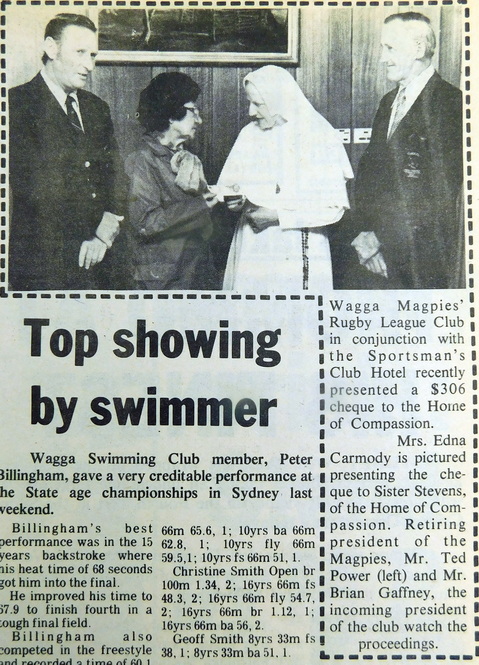 - The Wagga Magpies’ Rugby League Club in conjunction with the Sportsman’s Hotel presented a cheque for $306 to the Home of Compassion.
