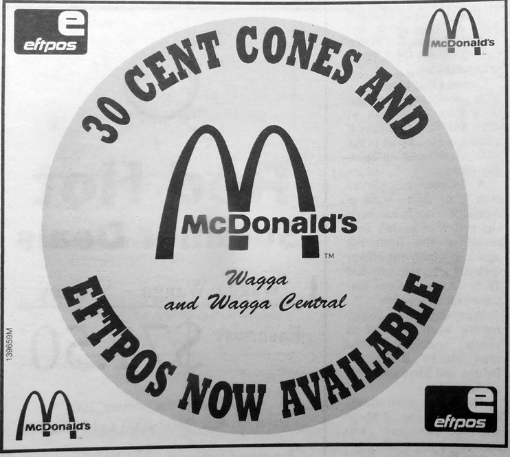 - McDonalds Wagga and Wagga Central are advertising that 30 cent cones and EFTPOS are now available.