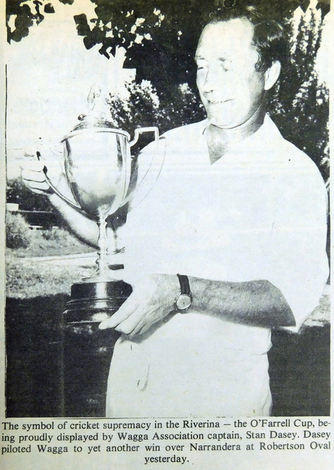- Wagga Association captain, Stan Dacey is pictured holding the symbol of cricket supremacy in the Riverina – the O’Farrell Cup after piloting Wagga to yet another win over Narrandera.