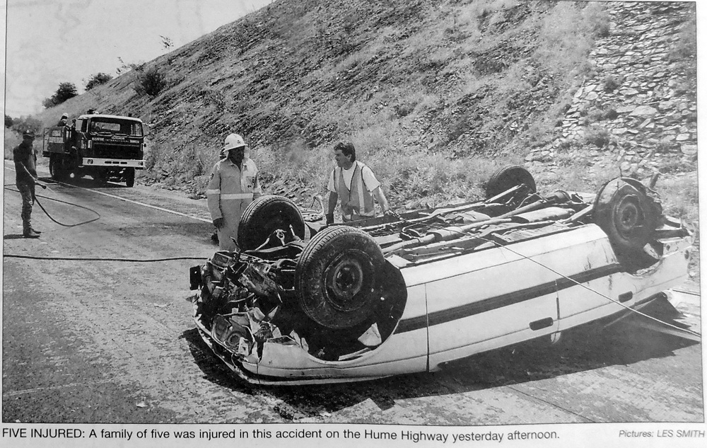 - A blown tyre is believed to be the cause of a single vehicle accident on the Hume Highway which injured five people including two children flown to Westmead Children’s Hospital with head injuries.