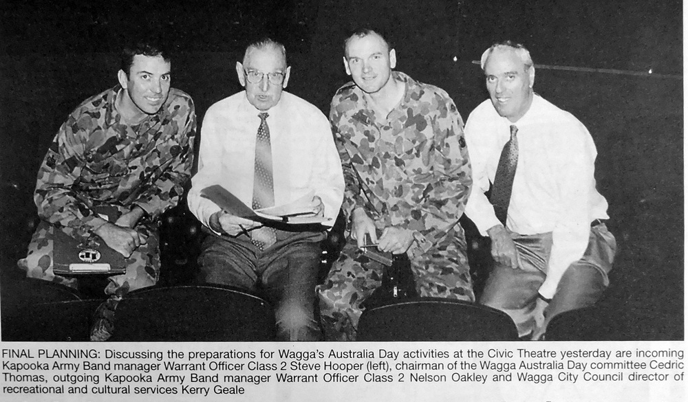 - Chairman of the Wagga Australia Day committee, Cedric Thomas and Wagga City Council director of recreational and cultural services, Kerry Geale are pictured discussing arrangements for 100th Anniversary of Federation celebrations with Steve Hooper and Nelson Oakley from the Kapooka Army Band.