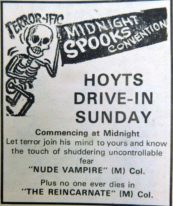 - The Terror-ific Midnight Spooks Convention commences at Hoyts Drive-In at midnight on Sunday and features the “Nude Vampire” and “The Reincarnate”.