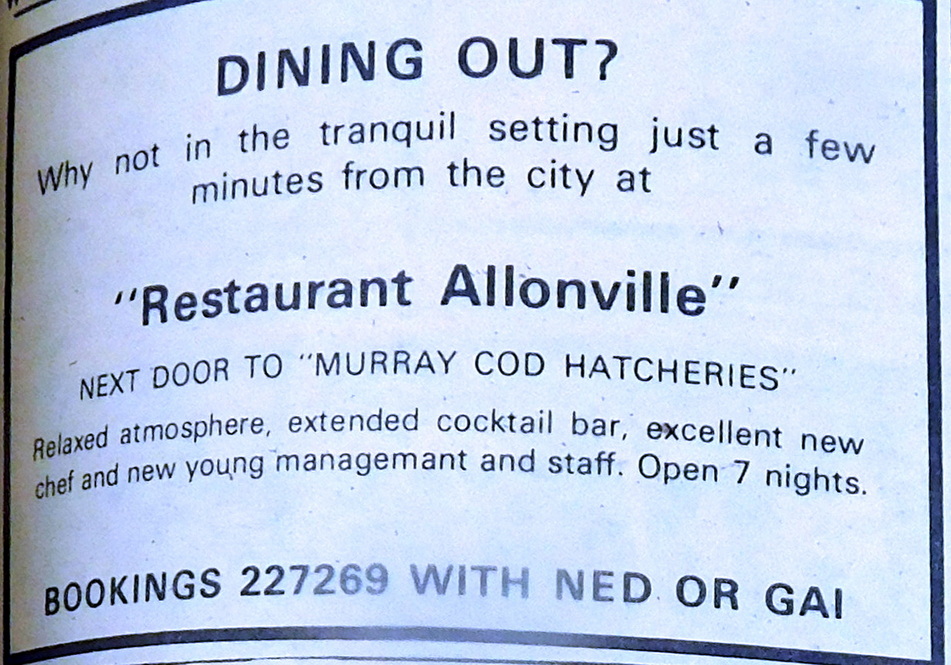 - “Restaurant Allonville” next door to Murray Cod Hatcheries is advertising a relaxed atmosphere, extended cocktail bar, excellent new chef and young management and staff.