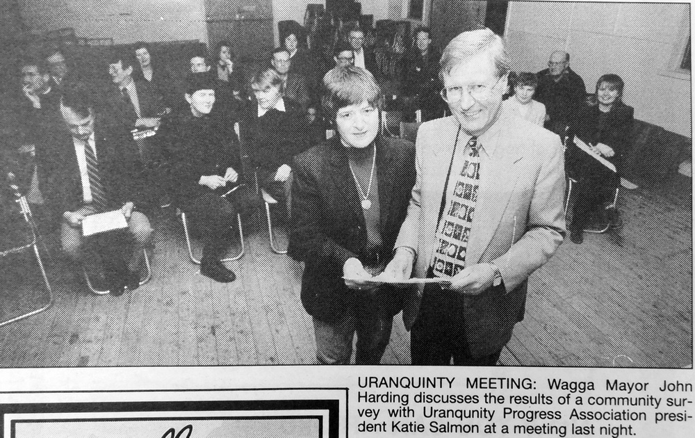 - Mayor, John Harding discussed the results of a community survey and the need for an Olympic Highway rest area at a meeting with members of the Uranquinty community.