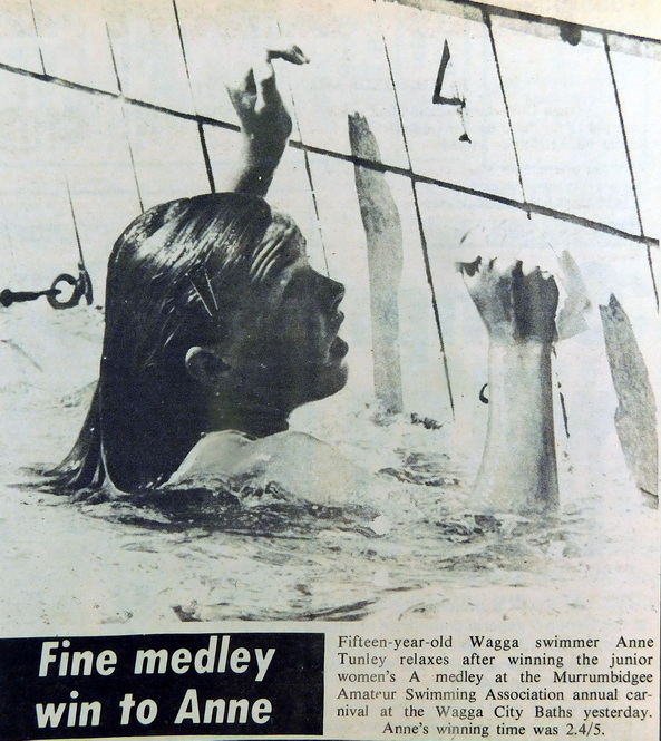 - Fifteen-year-old Wagga swimmer, Anne Tunley, set three records at the Murrumbidgee Swimming Association annual carnival.