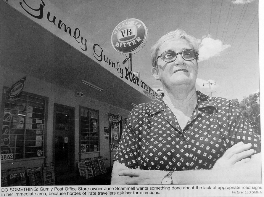- Gumly Post Office Store owner, June Scammell, is frequently asked for directions by irate travellers and is calling for improvements to road signs in the area.