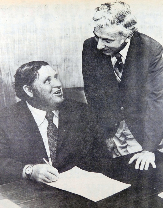 - Peter Hains is pictured signing a contract to purchase land at the Council’s industrial estate, which will become the site of a major distribution centre for the plumbing trade.