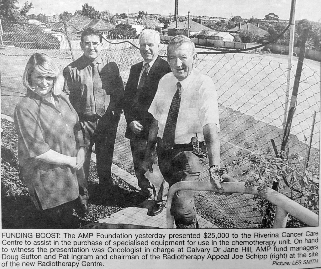 - The AMP Foundation, represented by fund managers Doug Sutton and Pat Ingram, presented $25,000 to the Riverina Cancer Care Centre, represented by chairman of the Radiotherapy Appeal, Joe Schipp, and Oncologist in charge at Calvary, Dr Jane Hill.