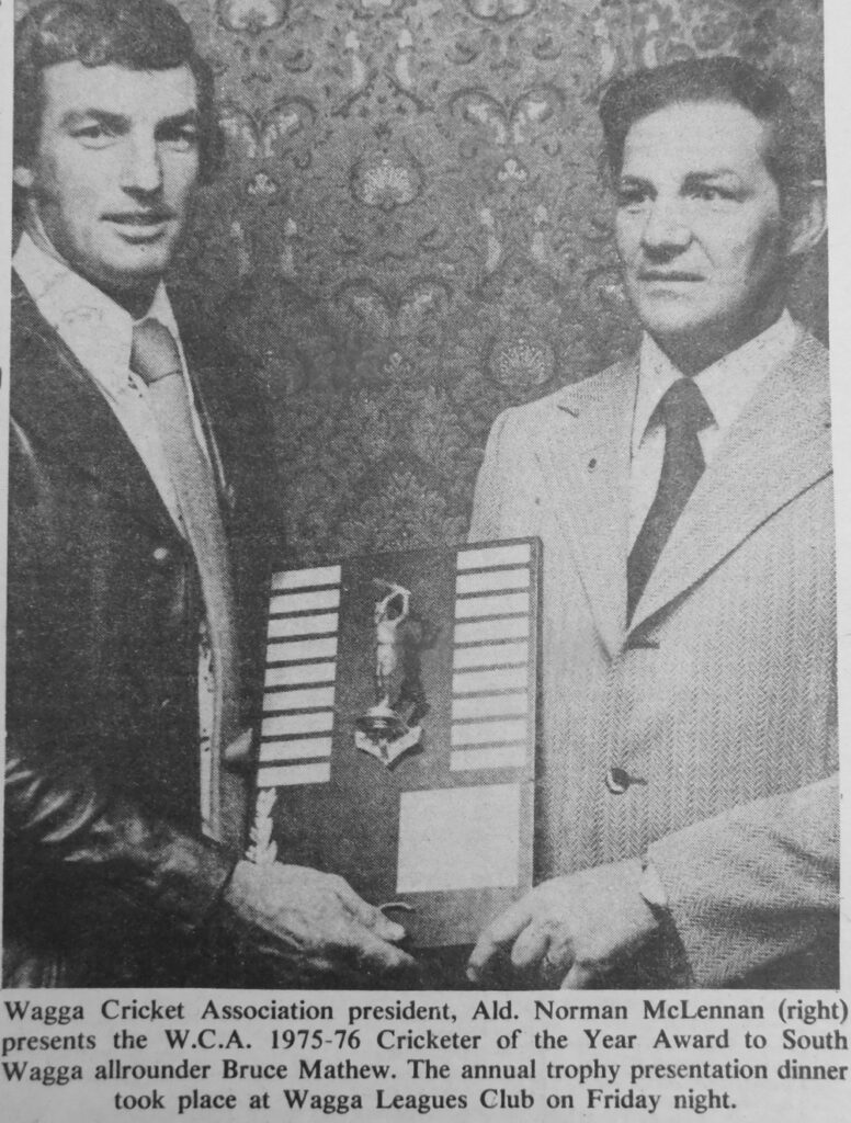 - Wagga Association president, Ald Norman McLennan, presented the W.C.A. 1975-1976 Cricketer of the Year Award to allrounder, Bruce Mathew, at the club’s annual trophy presentation dinner held at the Leagues Club.