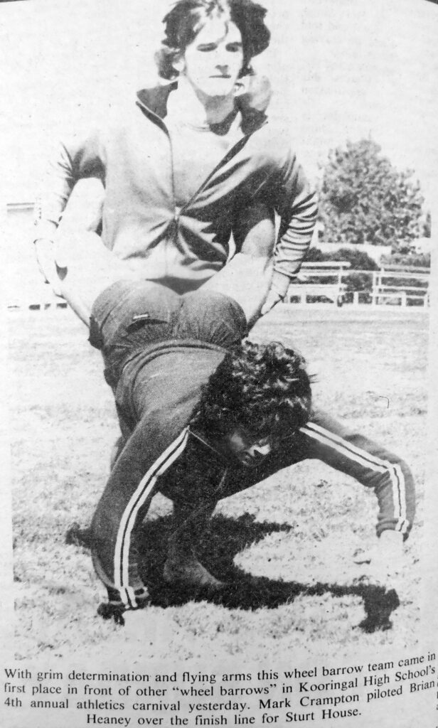 - Mark Crampton piloted Brian Heaney over the line to win the “wheelbarrows” race at the 4th annual Kooringal High School athletics carnival.