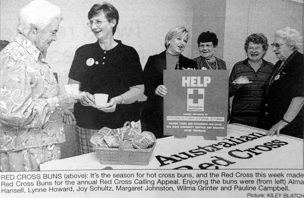 - Alma Hansell, Lynne Howard, Joy Schultz, Margaret Johnston, Wilma Grinter, and Pauline Campbell are pictured enjoying hot cross buns made by Red Cross for the annual Red Cross Calling Appeal.