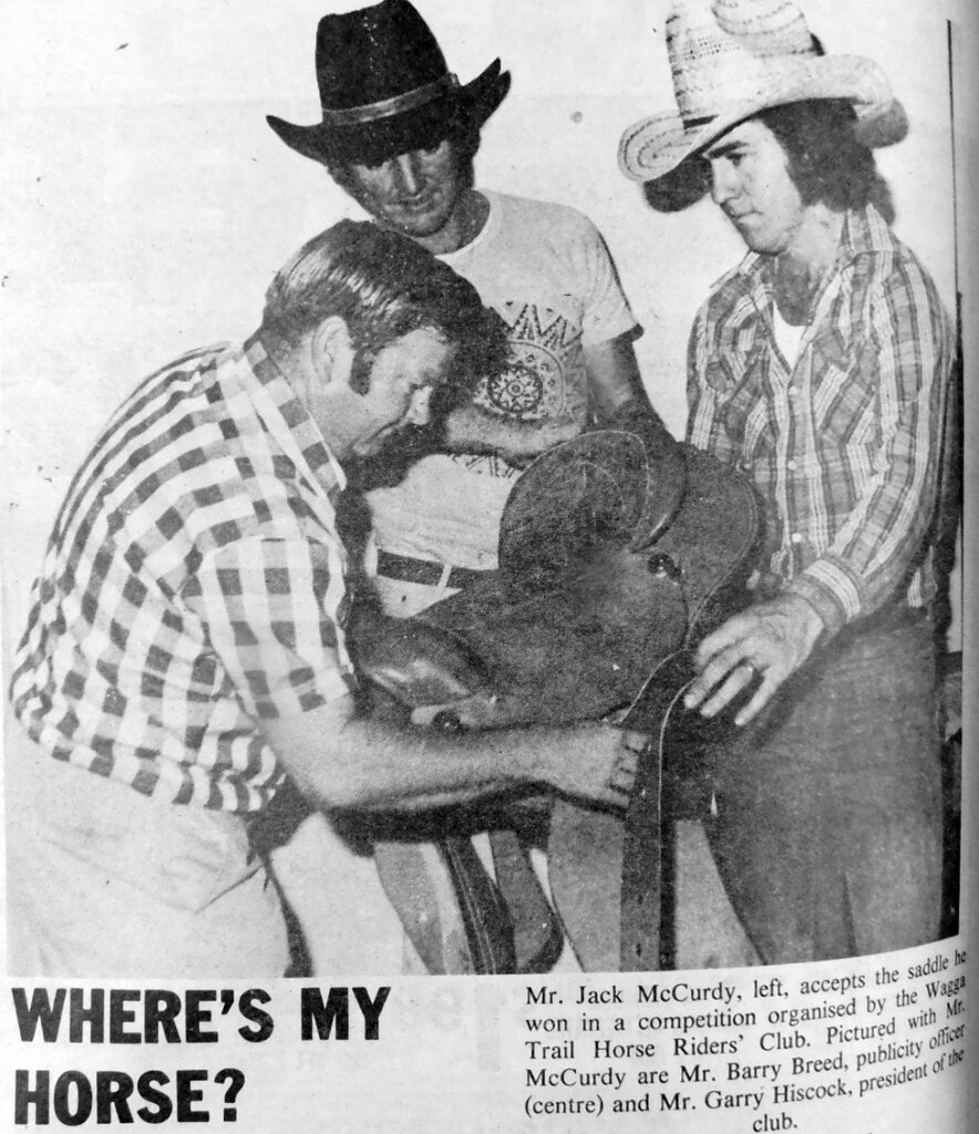 - Mr Jack McCurdy is pictured accepting a saddle, which he won in a competition organised by the Wagga Trail Horse Riders’ Club, from President Garry Hiscock and publicity officer, Barry Breed.