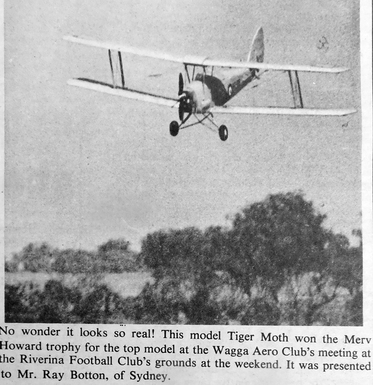 - 5000 spectators attended a two-day meeting of the Wagga Model Aero Club held in the Riverina Australian Football Club grounds. Winner of the Merv Howard trophy for the top model was Ray Botton with a Tiger Moth model.