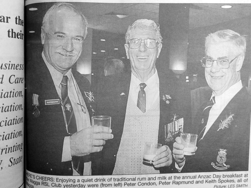 - Peter Condon, Peter Rapmund and Keith Spokes were among those enjoying a quiet drink of traditional rum and milk at the annual Anzac Day Breakfast.