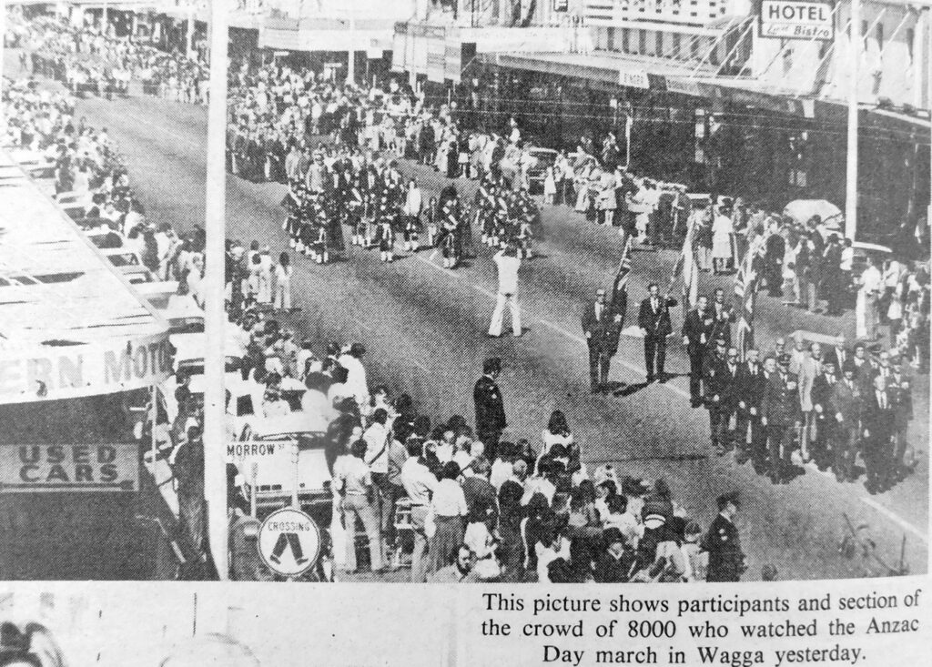 - A crowd of 8000 watched Wagga’s Anzac Day March in Baylis Street.