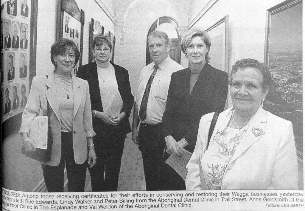 - Sue Edwards, Lindy Walker, Peter Billing, Anne Goldsmith and Val Weldon were among those presented with certificates by Wagga City Council for their efforts to conserve and restore their Wagga businesses.