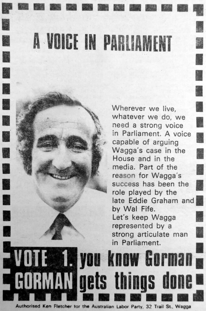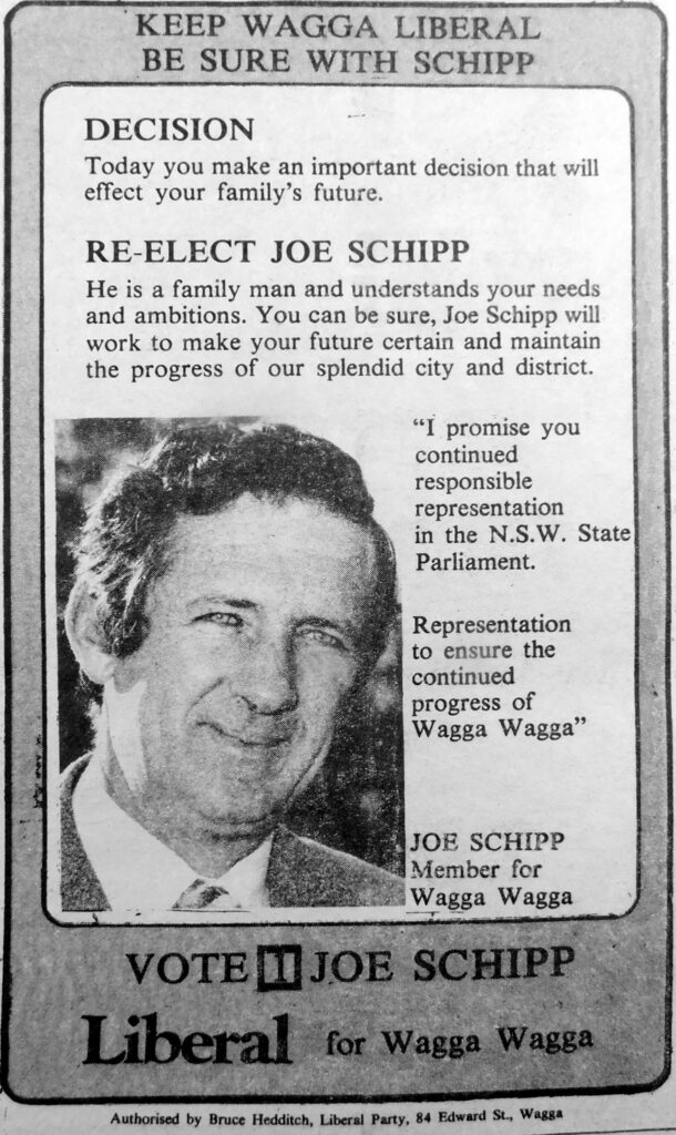 - Sitting Member for Wagga, Joe Schipp and Wagga Mayor, Ald Dick Gorman, are amongst candidates standing for election to the NSW State Parliament.