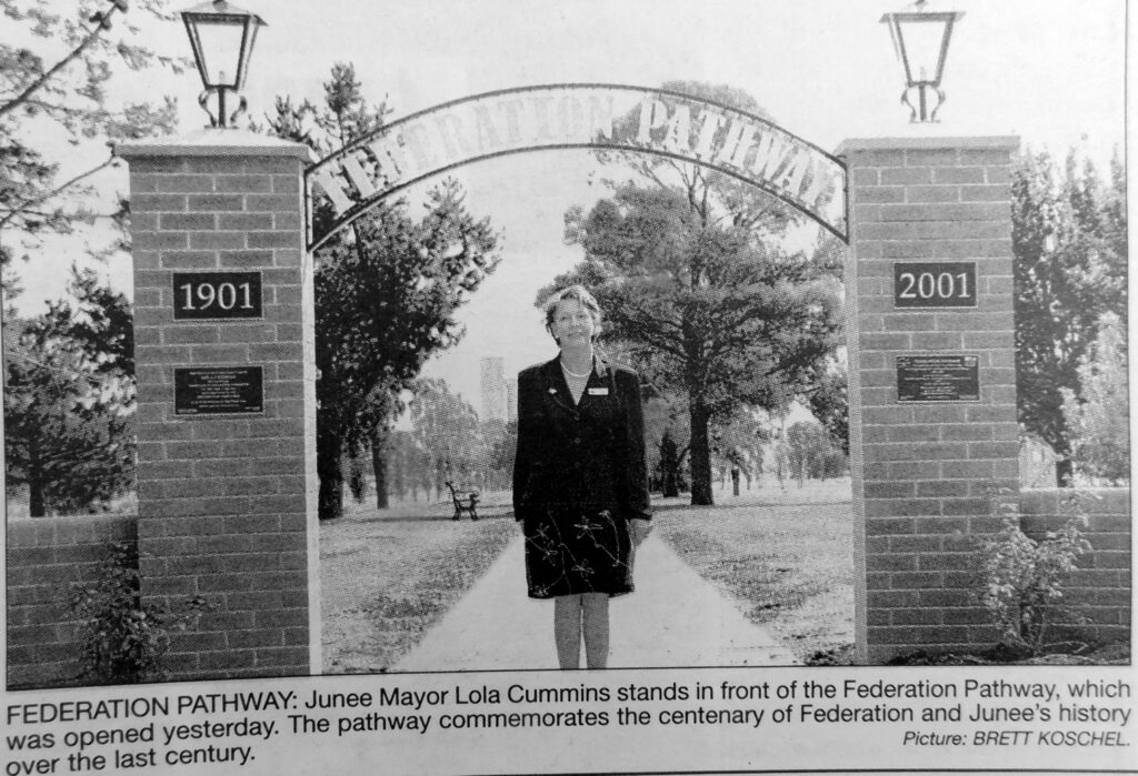 - Junee Mayor, Lola Cummins, is pictured standing in front of the Federation Pathway, which was opened this week to commemorate the centenary of Federation and Junee’s history over the last century.