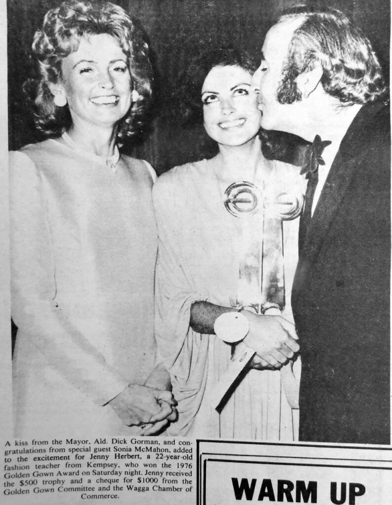- Jenny Herbert is pictured being congratulated by Mayor Ald Dick Gorman and special guest Sonia McMahon after winning the 1976 Golden Gown Award.