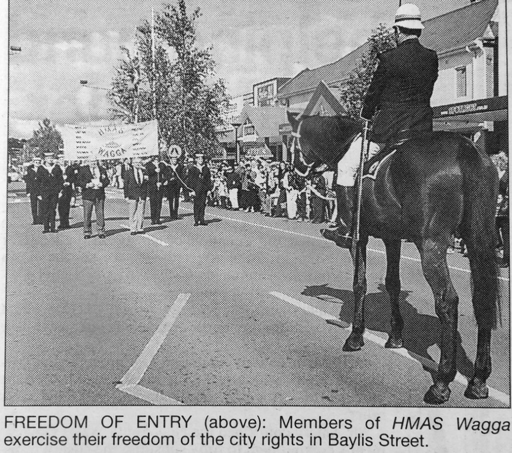 - Surviving members of HMAS Wagga were presented with the freedom of the city by Mayor Kevin Wales at a mayoral reception held in their honour.