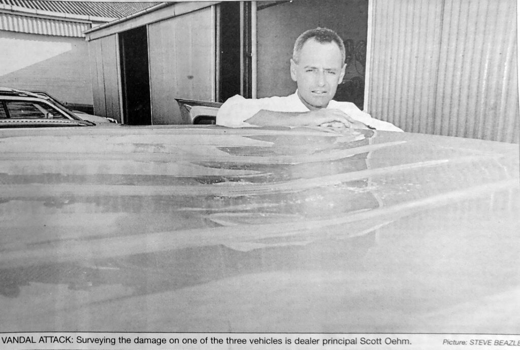 - Scott Oehm, the dealer principal of Jupiter Motors, in Edward Street, is ropable after vandals caused an estimated $5000 damage to three vehicles in his lot this week.