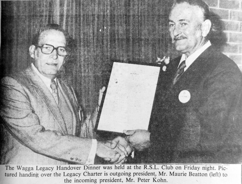 - Outgoing president, Maurice Beatton, handed over to incoming president Peter Kohn at the Legacy Handover Dinner held at the RSL Club.