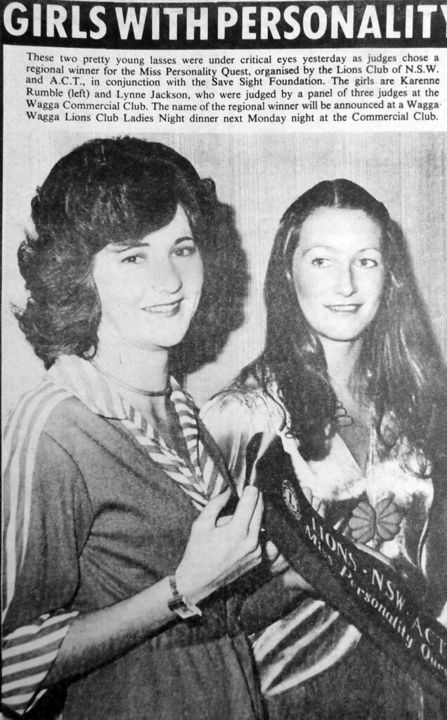 - Karenne Rumble and Lynne Jackson have entered the Miss Personality Quest organised by the Lions Clubs of NSW in conjunction with the Save Sight Foundation.