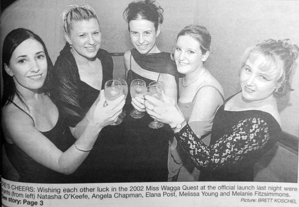 - Miss Wagga entrants, Natasha O’Keefe, Angela Chapman, Elana Post, Melissa Young and Melanie Fitzsimmons are pictured wishing each other luck at the official launch of the 2002 Miss Wagga Quest.