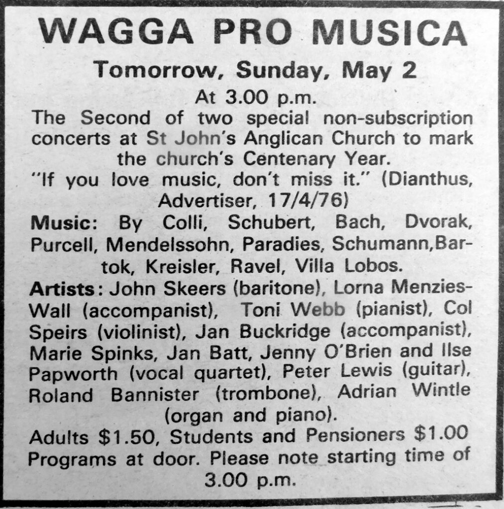 - Wagga Pro Musica is holding the second of two special non-subscription concerts at St John’s Anglican Church to mark the church’s Centenary Year.