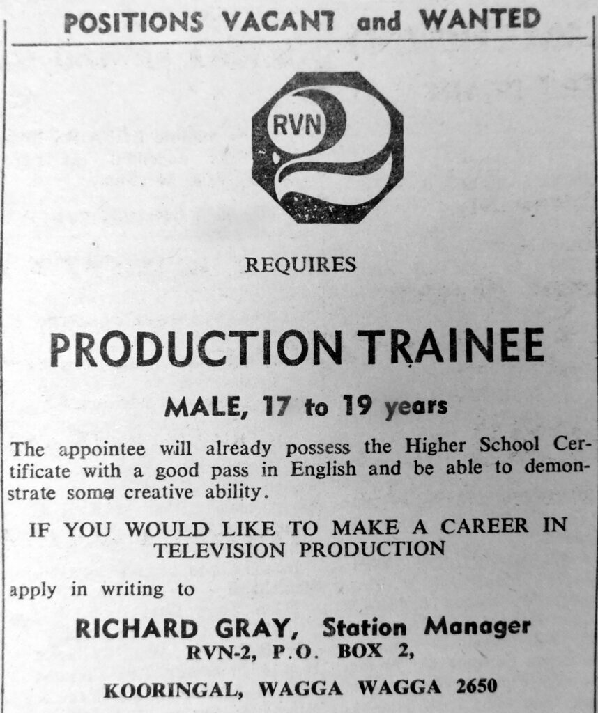 - RVN-2 Station Manager, Richard Gray, is advertising a vacancy for a male Production Trainee aged 17 to 19.