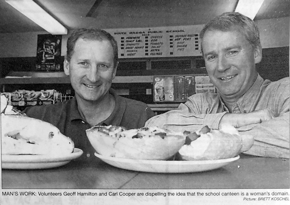 - Geoff Hamilton and Carl Cooper are pictured working as volunteers at the South Wagga Public School canteen.
