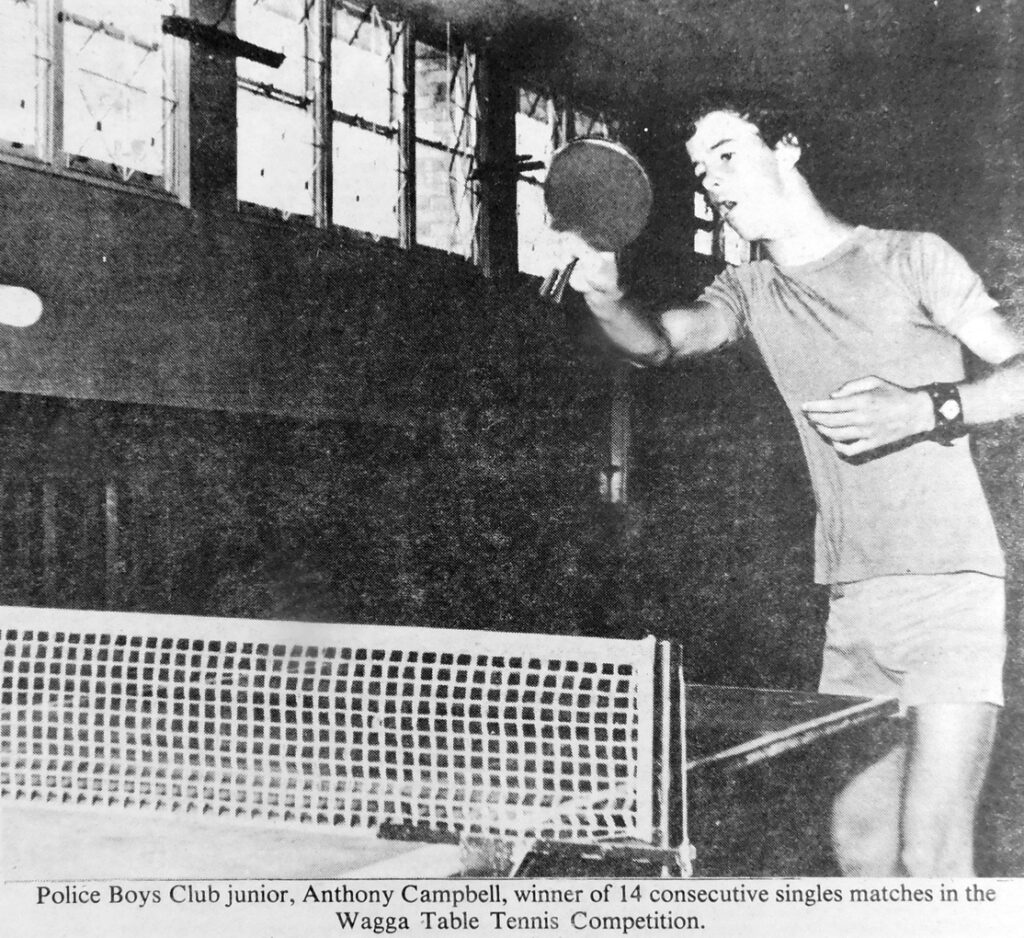 - Police Boys Club junior, Anthony Campbell, won 14 consecutive singles matches in the Wagga Table Tennis Competition.