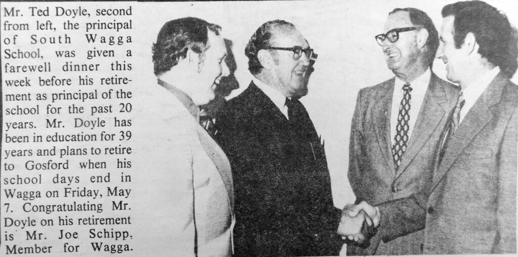 - Mr Ted Doyle, principal of South Wagga Public School, who is retiring after 20 years at the school, was given a farewell dinner.