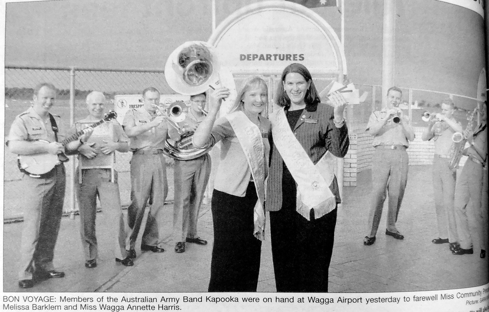 - The Australian Army Band Kapooka were on hand to farewell Miss Community Princess, Melissa Barklem and Miss Wagga Wagga, Annette Harris as they left Wagga Airport on their trip to Leavenworth.