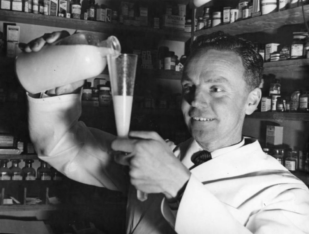 In the 1950’s and even 60’s and 70’s it was still quite common for Pharmacists to individually prepare prescriptions for their patients as Morris is pictured doing here.