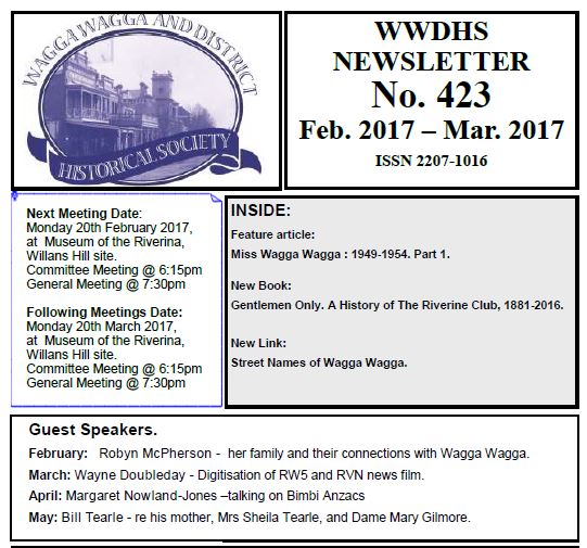 Our latest Newsletter No. 423 has been distributed to members in hard copy and electronic form. Past editions can be viewed in the member area of our website www.wwdhs.org.au