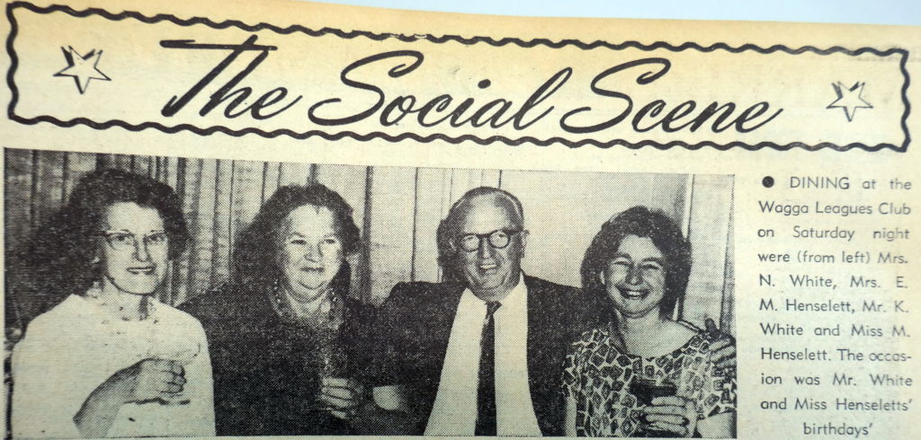 Pictured here in the Daily Advertiser from January 1968 are Mr K White and Miss M Henselett celebrating their birthdays with Mrs N White and Mrs E M Henselett, all dining at the Wagga Leagues Club.