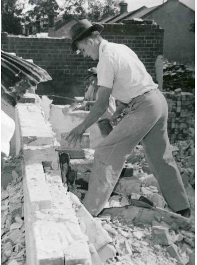 Wal Fife, who represented Wagga Wagga in both State and Federal electorates from 1957 until 1993 is pictured here as a young man and a member of the Jaycees (Junior Chamber of Commerce), cleaning bricks from Edward Street houses which had been demolished. These bricks were used in the construction of the Kurrajong School on Willans Hill.